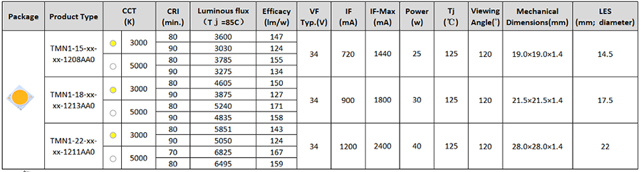 • 极小发光面,提供极高单位面积光密度