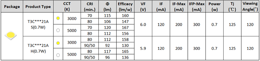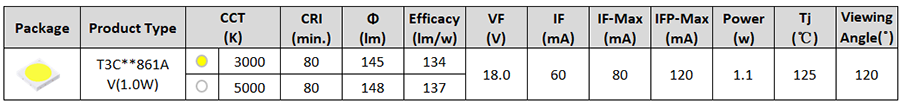 产品特性: • 高耐热EMC封装 • 紧凑的封装尺寸规格 • 高显色性CRI>80 • 高光效,SDCM<3 • 低热阻 • 耐高电流驱动 • 通过lm-80认证