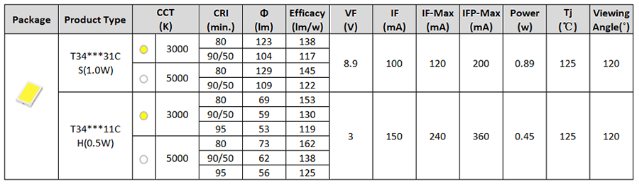 产品特性: • 高耐热EMC封装 • 紧凑的封装尺寸规格 • 高显色性CRI>80 • 高光效,SDCM<3 • 低热阻 • 耐高电流驱动 • 通过lm-80认证