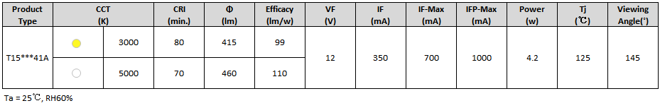 产品特点: • 使用高导热陶瓷基板 • 高流明输出及高光效 • 高显色性 • 色容差SDCM<3 • 低热阻 • 耐高电流驱动